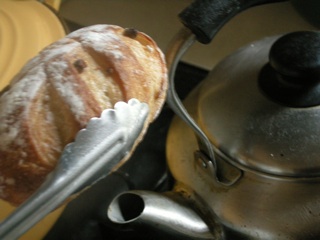 2. ヤカンの口から出る湯気にパンをくぐらせます。