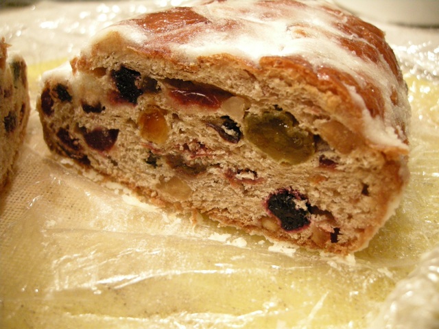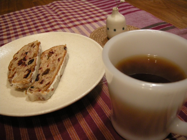 レーズンが嫌いな理由は、酸味と甘みが妙チクリンに絡まる感じがダメなんですね。けど、このシュトーレンは味がしっかりしてて、レーズンも「全体の味の中に含まれたひとつの要素」となってる感じでレーズンだけが目立つ事がないのです。調味料(香辛料)みたいなノリ。