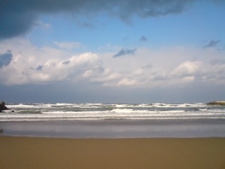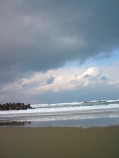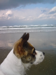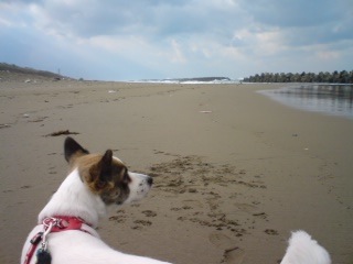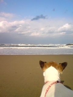 海岸で俺の休憩がてらちょっとのんびり波を眺めてたら、急にザザーって波が押し寄せてきた。今日は雨もパラついてたし、俺、ヤッケと長靴だったしそのままいたらニコの足下にも海水がザザー。
